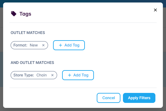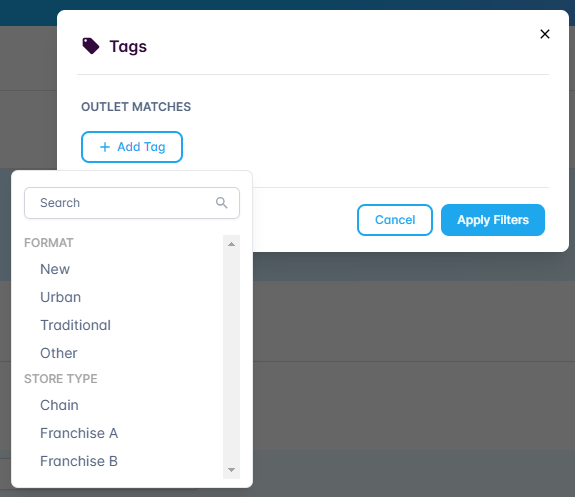 Outlet Tags denote specific attributes of a given outlet. If your organisation set these up during onboarding, the Tags filter will enable you to filter your view on one or more tags.