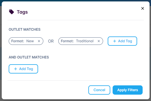 In the example below, this would return data for any outlets that have either the "New" or "Traditional" store format tag.