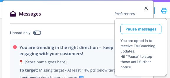 You may choose to resume at any time. Open the "Messages" panel again from the TruHub product header, select "Preferences" and then choose "Resume".
